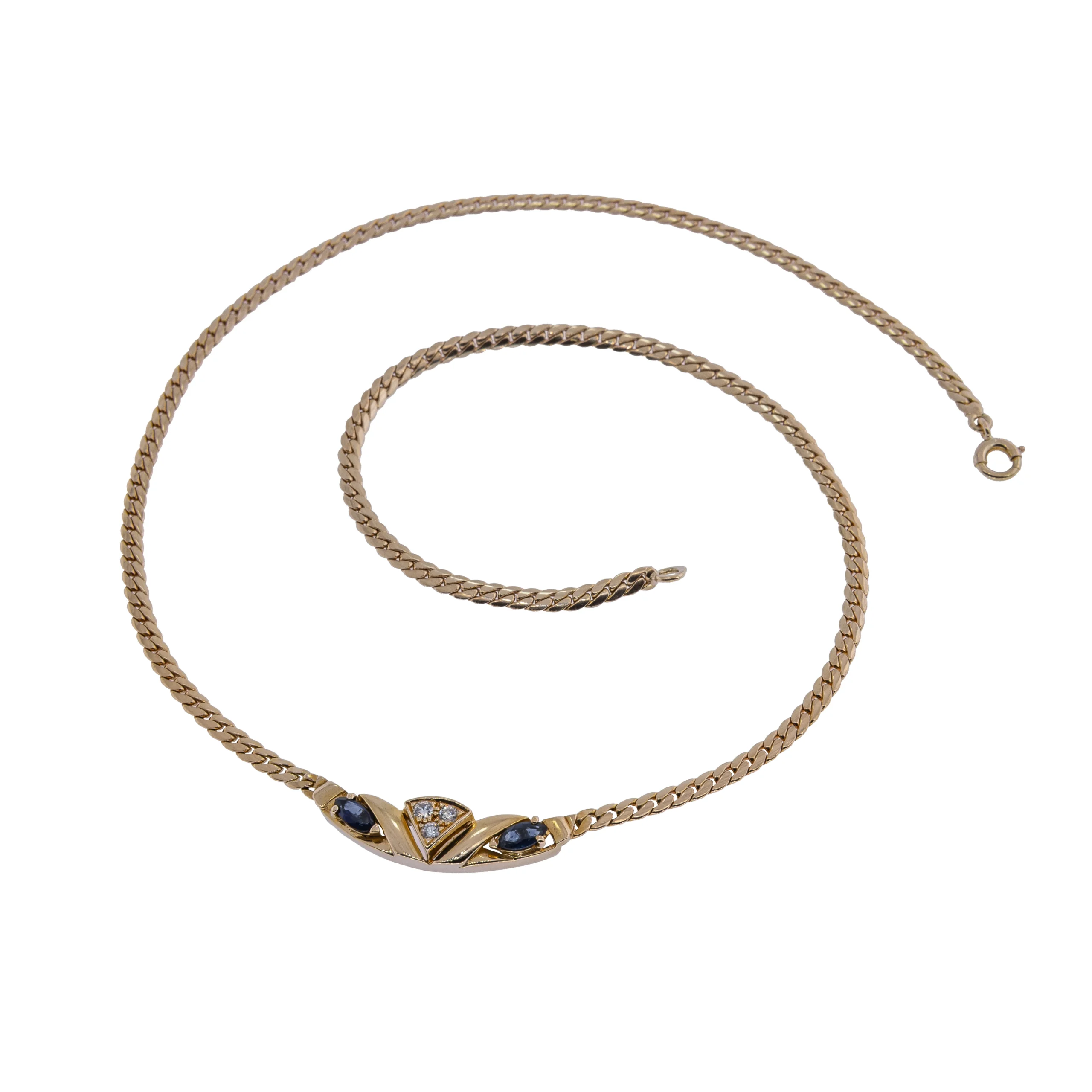 Collier en or jaune 18 carats avec 2 saphirs navettes 0,22ct chacun et 3 brillants 0,042ct, fermoir ressort.